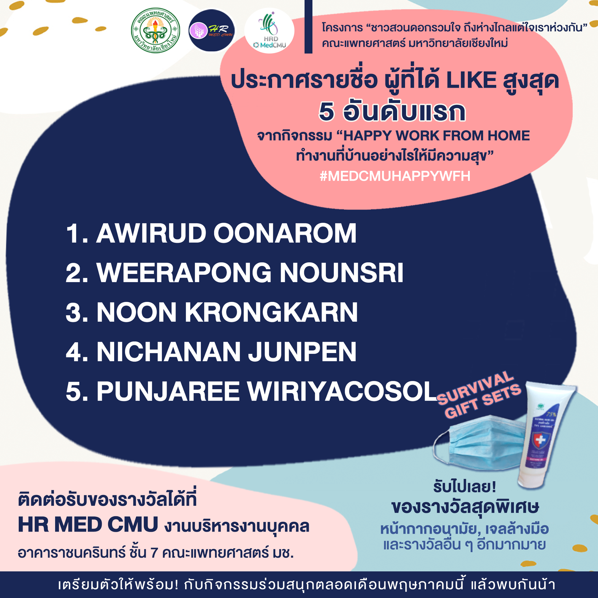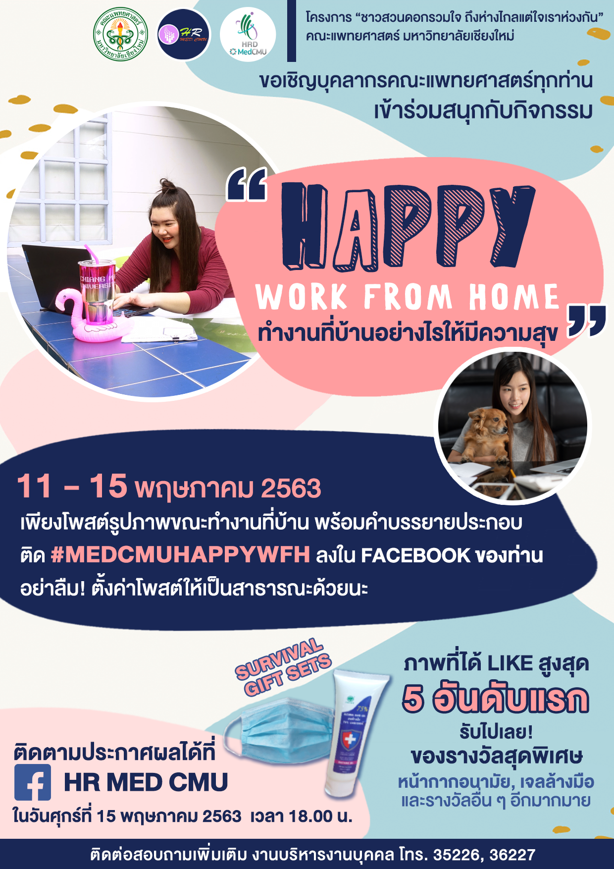 อยู่บ้านนาน ๆ เหงามั้ย ? …ชาวสวนดอกรวมใจ ถึงห่างไกล แต่ใจยังห่วงกัน… ขอเชิญชวนบุคลากรชาวสวนดอกทุกท่าน ร่วมกิจกรรมสานสัมพันธ์ให้ใจเราใกล้กัน ตลอดทั้งเดือนพฤษภาคม และขอแนะนำกิจกรรมแรกกก“Happy Work from Home ทำงานที่บ้านอย่างไรให้มีความสุข”เพียงโพสต์รูปการทำงานที่บ้านพร้อม #medcmuhappywfh บน fb