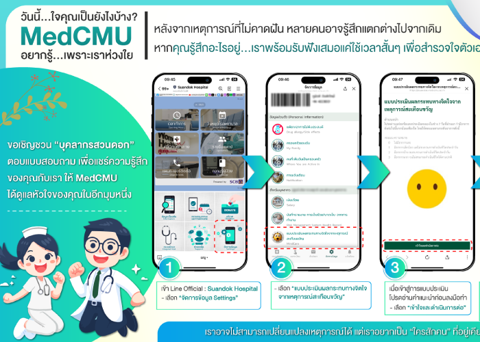 [vc_row][vc_column width=”1/4″][/vc_column][vc_column][vc_single_image image=”12991″ img_size=”large” alignment=”center” css=””][/vc_column][vc_column width=”1/4″][/vc_column][/vc_row][vc_row][vc_column width=”1/3″][/vc_column][vc_column width=”1/3″][vc_column_text css=””]วันนี้…ใจคุณเป็นยังไงบ้าง? MEDCMU อยากรู้…เพราะเราห่วงใย🫶 หลังจากเหตุการณ์ที่ไม่คาดฝัน เราเข้าใจว่าหลายคนอาจรู้สึกแตกต่างไปจากเดิม
