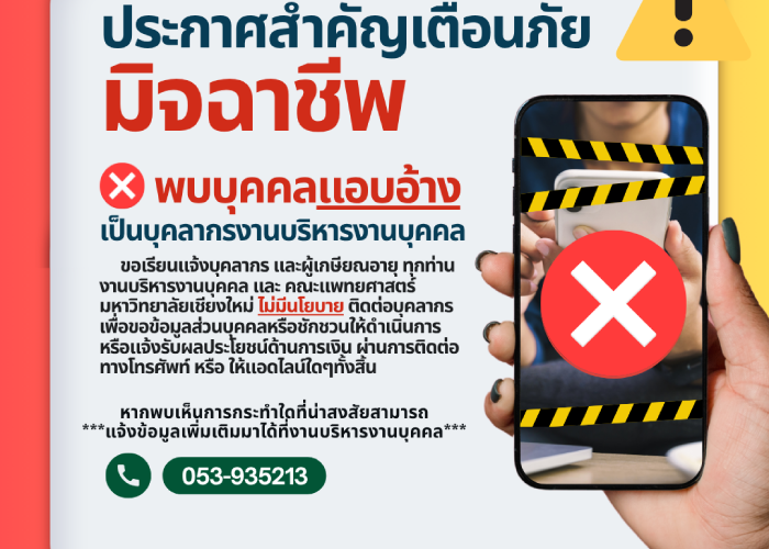 [vc_row][vc_column width=”1/4″][/vc_column][vc_column width=”1/2″][vc_single_image image=”13402″ img_size=”large” alignment=”center” style=”vc_box_rounded” css=””][/vc_column][vc_column width=”1/4″][/vc_column][/vc_row][vc_row][vc_column width=”1/4″][/vc_column][vc_column width=”1/2″][vc_column_text css=””]⚠️️ประกาศสำคัญเตือนภัย มิจฉาชีพ⚠️ 📢ขอเรียนแจ้งบุคลากร