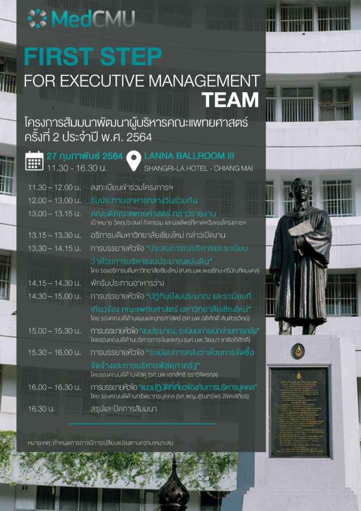 ในการนี้ คณะฯ เห็นควรให้จัดโครงการสัมมนาพัฒนาผู้บริหารคณะแพทยศาสตร์ ครั้งที่ 2 ประจำปี พ.ศ. ๒๕๖๔ “First step for executive management team” ให้แก่คณะผู้บริหารคณะแพทยศาสตร์ เพื่อสร้างความรู้ความเข้าใจ และพัฒนาทักษะ ความรู้ที่เกี่ยวข้องในการดำเนินงาน แก่คณะผู้บริหารฯ รวมทั้งสามารถแลกเปลี่ยนเรียนรู้ ปัญหา และอุปสรรค เพื่อการเตรียมความพร้อมในการดำเนินงานในวาระการบริหารประจำปี ๒๕๖๔ – ๒๕๖๗ ได้อย่างมีประสิทธิภาพ และร่วมขับเคลื่อนคณะแพทยศาสตร์ให้บรรลุเป้าหมายได้อย่างแท้จริง[/vc_column_text][vc_column_text]